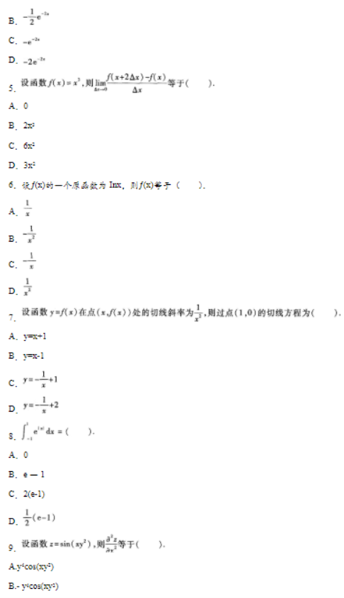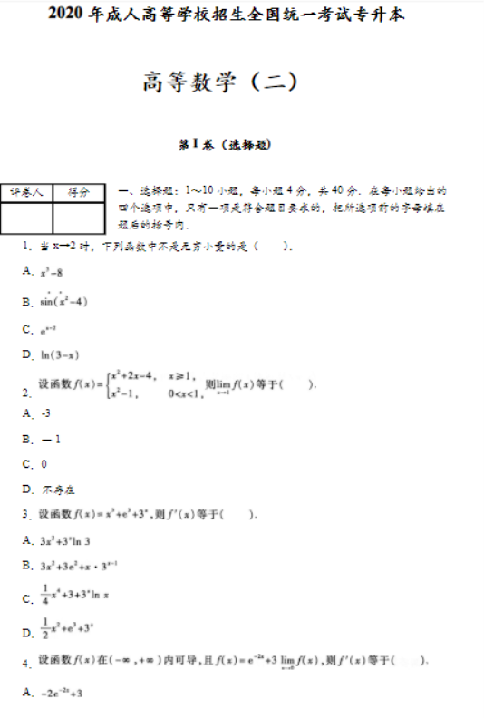 2020成人高考专升本《高等数学二》考前冲刺模拟试题及参考答案